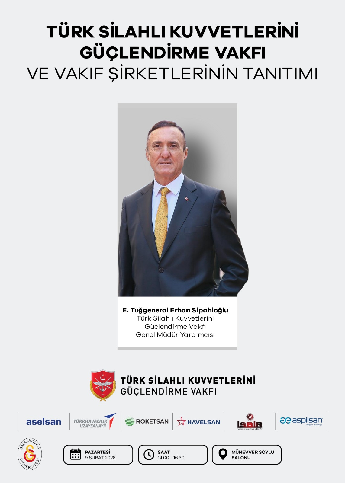 09.01.2026 Pazartesi günü 14.00-16.300 saatleri arasında Türk Silahlı Kuvvetlerini Güçlendirme Vakfı Genel Müdür Yardımcısı Emekli Tuğgeneral Sayın Erhan SİPAHİOĞLU tarafından Münevver Soylu Salonunda gerçekleştirilecek olan "Türk Silahlı Kuvvetlerini Güçlendirme Vakfı ve Vakıf Şirketlerinin Tanıtımı Etkinliği" Enstitümüz tüm öğrencilerinin katılımına açık olup, etkinlikte soru-cevap bölümü de yer alacaktır.